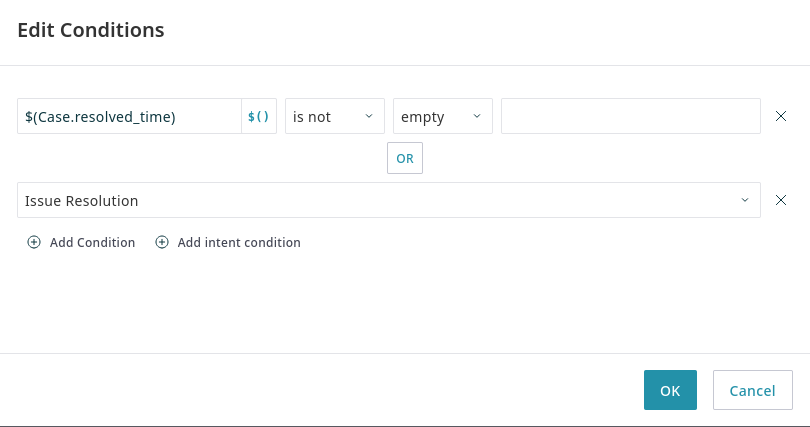 Adds a condition based on the detection of one or more Intents. When an Intent is detected, the condition is evaluated as True.