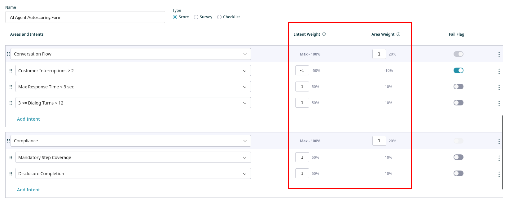 The scoring system is hierarchical: individual intents contribute to their area score based on their weight, and each area contributes to the final form score based on the weight assigned to the area. When creating a form, you can see how much each Intent and Area will contribute to the final score of the form.