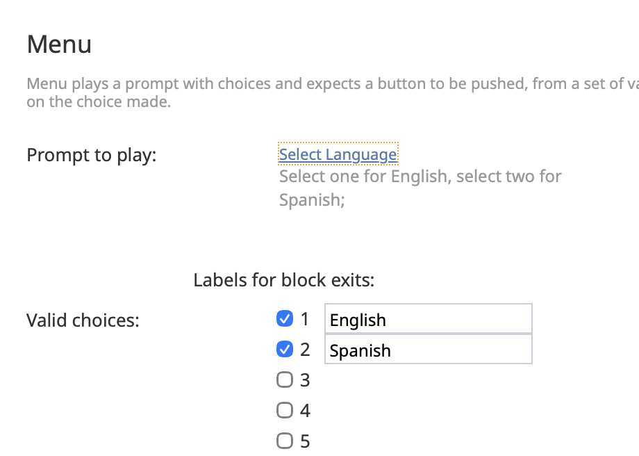 Add a Menu block to the scenario. Configure the prompt to instruct callers to select their preferred language (for example, press 1 for English or press 2 for Spanish). In the Valid Choices section, configure the corresponding inputs. Each Menu exit will be used to route the call based on the caller’s language selection.