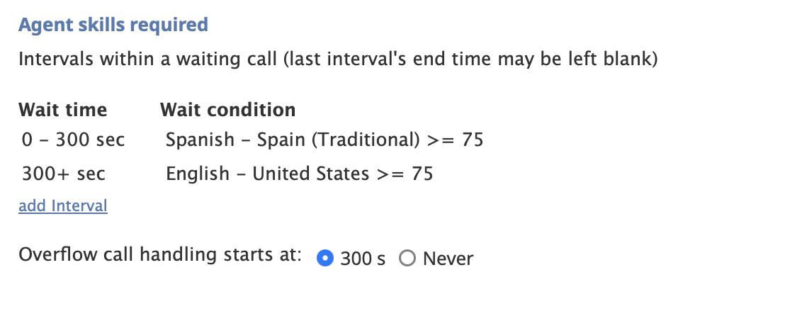- Interval 2: Relax the language requirement so the call can also be routed to English-speaking agents. In the Overflow call handling starts at section, select the second interval so calls routed through this interval are marked as overflow for reporting purposes.