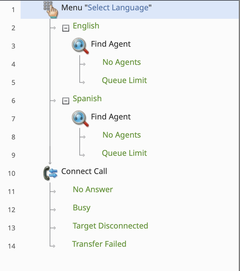 From the English exit of the Menu block (Method 1), add a separate Find Agent block. Configure this block to route calls directly to English-speaking agents (with or without escalation, depending on your requirements).