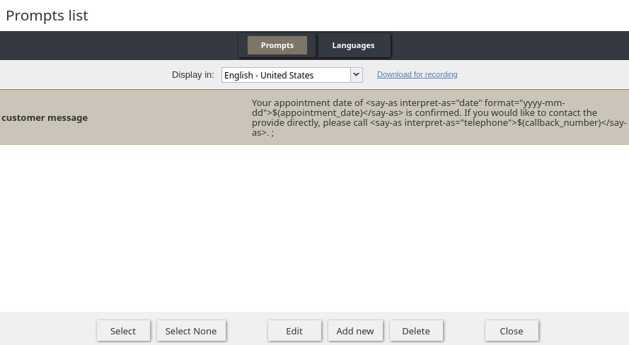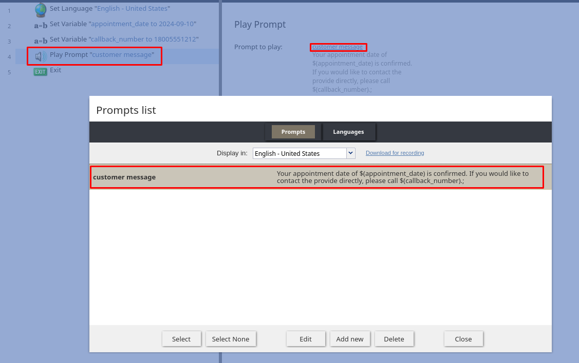 In your scenario, add the Play Prompt block where you want to communicate the appointment details to the customer. Inside the Play Prompt block, use the variables to play a message to the user by adding a Voice segment to the prompt: