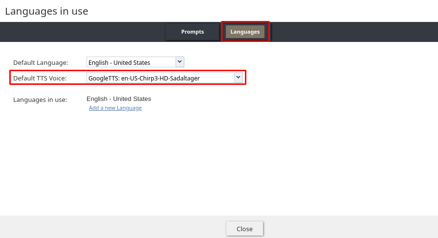For the SSML tags to function, the block must utilize a compatible TTS engine. Navigate to the Language tab within the block settings. Under Default TTS Voice, select the desired voice from your TTS integration (e.g., Google Cloud TTS or IBM Watson).