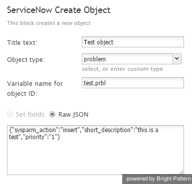 The ServiceNow Create Object scenario block creates a specified object in the ServiceNow database.