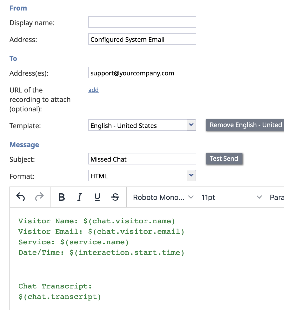 From each missed-chat exit of the Find Agent block, add an Email block. Configure the email by specifying the To and From addresses, then insert the required chat details into the email body by referencing the appropriate system variables. The following example and screenshot illustrate how chat and interaction variables can be added to the Email block to include visitor details and the full chat transcript.