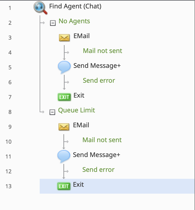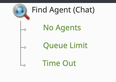 A chat is considered missed when no agent is logged in, the queue limit is reached, or the chat waits too long in the queue. Exits matching the first two scenarios ("No Agents" and "Queue Limit") are built into the Find Agent block and will appear automatically. For the third scenario, if a chat waits too long in the queue, a "Timeout" exit will appear only if escalation intervals are configured. In the following steps, we will use these exits to route the chat to email.