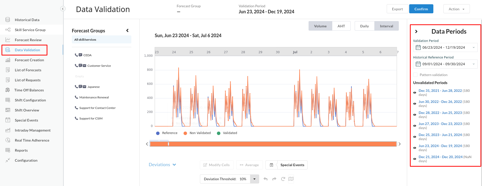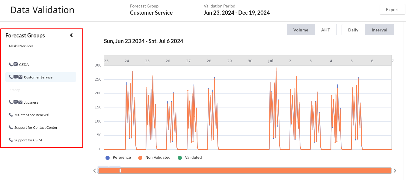 Once your periods are selected, analyze the data to find and process significant deviations. First, select the service you want to validate from the Forecast Groups menu. The graph and table will update to show data for your selection. Any validation changes you make will apply only to this group.