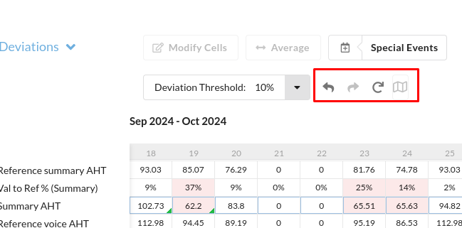 • Reset (circular arrow): Reverts all modifications made during the current validation session for the selected period.