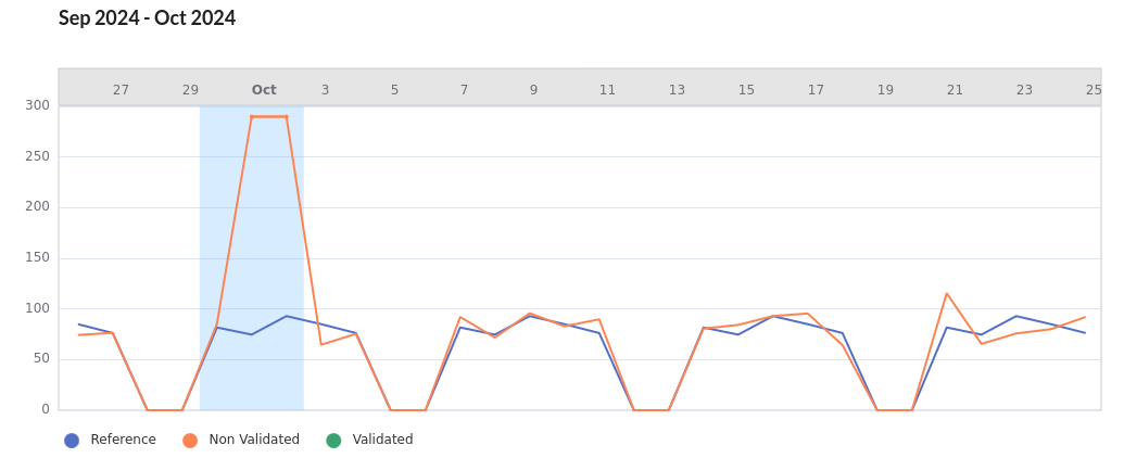 • Validation Period: The period of recent data for review and cleaning. Recent unvalidated periods are displayed in a list; clicking one populates the date selector. You may also input a custom date range.