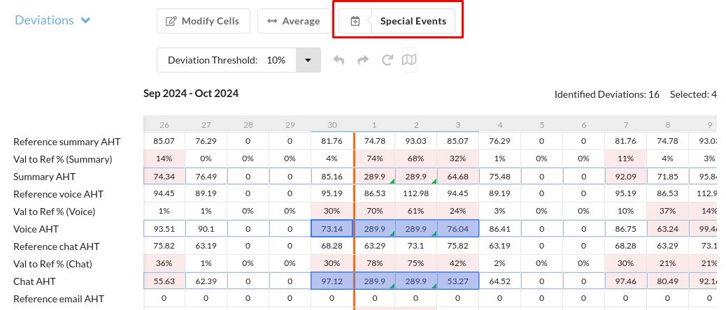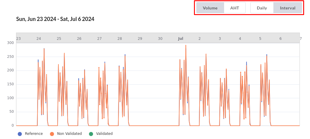 Once you've selected a service, use the toggles above the graph to switch your view. You can analyze deviations in interaction Volume or Average Handle Time (AHT), and set the data range to Daily or Interval.