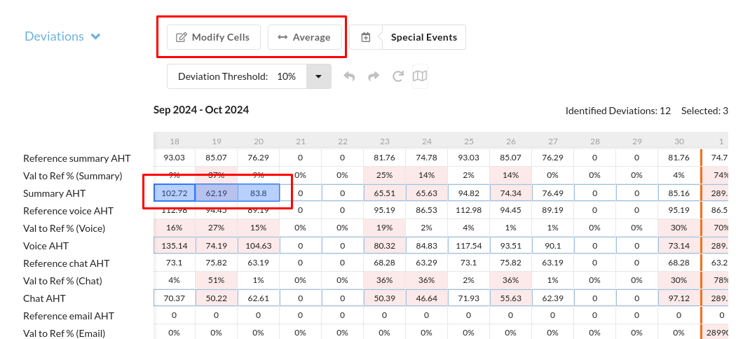• To select multiple cells, click and drag, or hold Ctrl (or Cmd) and click individual cells. With multiple cells selected, you can change them all at once using the Modify Cells or Average button.